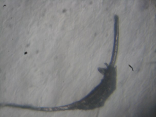 The following shots are from a fibre that came from my leg. I noticed there was an itchy, red little bump on my leg, much like a pimple. I then noticed there was a hard little fibre sticking out of the middle. I got some tweezers and started to pull it out, but when I let go of it to get a better grip, it slid back into my leg by itself. I then pulled it out completely and it felt like a really strong spiderweb coming out. There was no pain but I could definitely feel it sliding out of my skin.