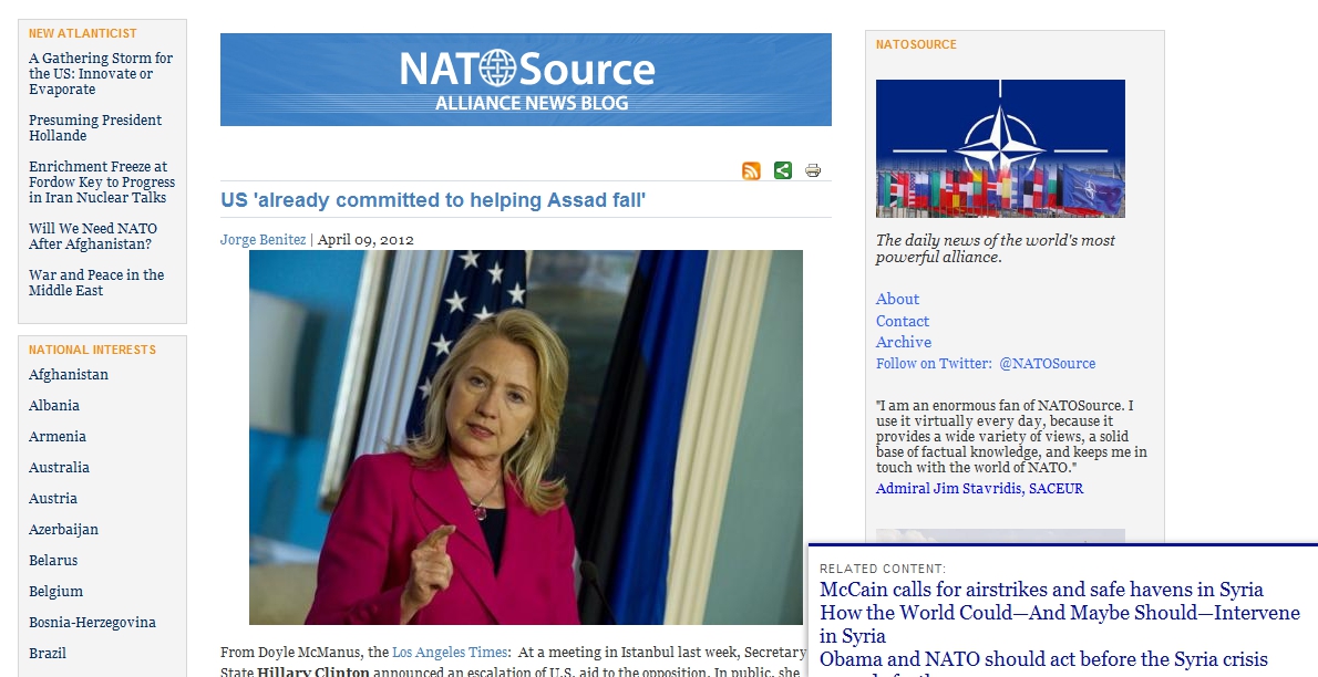 Image: NATO’s official “Alliance News Blog proudly reports that the US is already committed to helping “Assad fall” and is simply using the lull in fighting brought on by Kofi Annan’s disingenuous “peace plan” to rearm, reorganize, and redeploy their terrorist proxy forces against Assad. The op-ed featured on NATO’s blog was featured in the LA Times and written by CFR member Doyle McManus. (click image to enlarge)