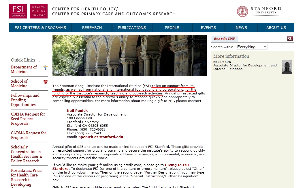 The Center for Health Policy is a subsidiary of the Freeman Spogli Institute for International Studies (FSI). So who are these “friends,” national and international foundations and corporations funding the research of FSI and its subsidiary, the Stanford Center for Health Policy?
