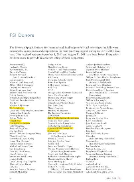 “The Freeman Spogli Institute for International Studies (FSI) relies on support from its friends, as well as from national and international foundations and corporations, for the funding of the Institute’s research, teaching and outreach activities.”