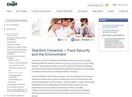Image: Conflict of interest? Strange that Stanford University is partnered with agricultural giant Cargill and just so happens to come out with a study that suggests organic food is no better than its big-agri competition. According to Stanford University, Cargill has donated at least 5 million dollars for the creation of a Center on Food Security and the Environment (FSE). Cargill’s website has a page describing its partnership with Stanford which can be found here. Cargill and many others also are listed as donors by Standford University in their 2011 Annual Report (page 38, .pdf).