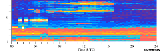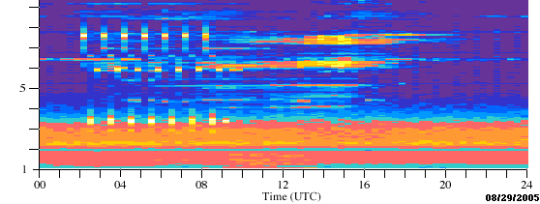 ** Katrina – hurricane – The Haarp facility was highly active in the weeks prior, during, or shortly after Katrina became a hurricane out of Tropical Depression Twelve. The colored “slots”, resembling piano keys, are visual reflections of Haarp activity in the area Katrina was active. This is called a “waterfall chart”. The vertical axis is a frequency reading, measuring from 1 to 30 MHz (10).
