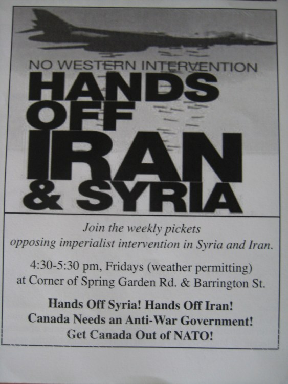 HALIFAX ANTI-WAR PROTEST — HANDS OFF IRAN & SYRIA! NO WESTERN INTERVENTION (weekly pickets every Friday)