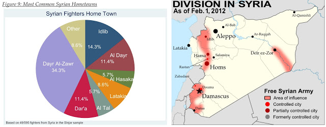 Image: (Left) West Point’s Combating Terrorism Center’s 2007 report, “Al-Qa’ida’s Foreign Fighters in Iraq” indicated which areas in Syria Al Qaeda fighters filtering into Iraq came from. The overwhelming majority of them came from Dayr Al-Zawr in Syria’s southeast, Idlib in the north near the Turkish-Syrian border, and Dar’a in the south near the Jordanian-Syrian border. (Right) A map indicating the epicenters of violence in Syria indicate that the exact same hotbeds for Al Qaeda in 2007, now serve as the epicenters of so-called “pro-democracy fighters” and also happen to be areas the US CIA is admittedly distributing weapons and other aid in.