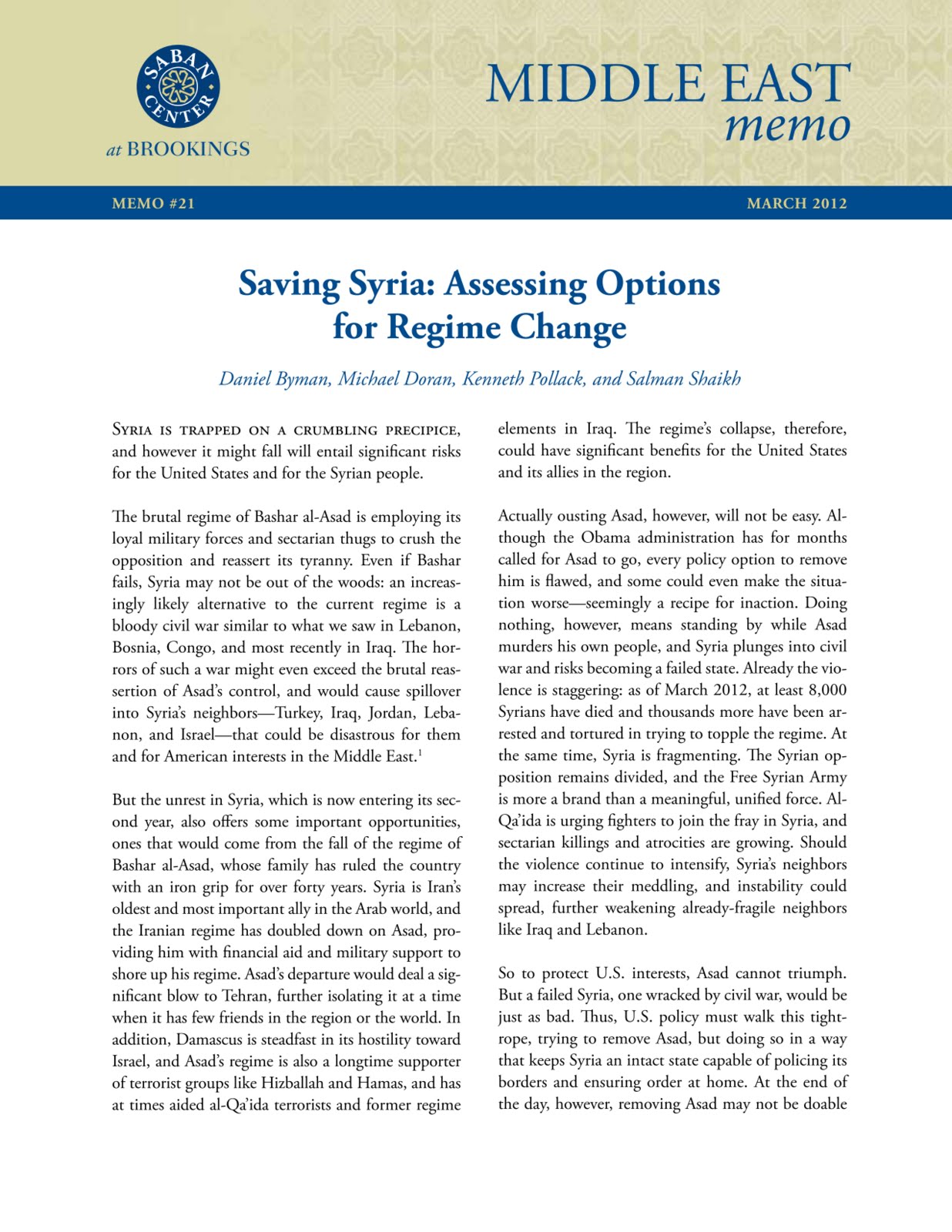Image: Brookings Institution’s Middle East Memo #21 “Assessing Options for Regime Change (.pdf),” makes no secret that the humanitarian “responsibility to protect” is but a pretext for long-planned regime change. Failing to achieve this, US policy makers are satisfied to arm and fund militants in an effort not to end the violence but to perpetuate it and its costly effects to keep a “regional adversary weak.” Clearly, the West’s interests in Syria are geopolitical, not humanitarian, and plan options to purposefully compound the humanitarian catastrophe it has engineered from the very beginning.
