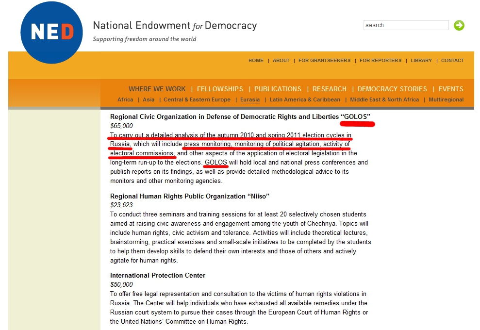 In Wall Street Journal’s article, “Russia’s Dubious Vote,” the authors admit that “the analysis doesn’t in itself prove fraud in Russia’s Dec. 4 parliamentary elections.” But the WSJ then cites “local and international observers,” that corroborate their findings of “fraud” with claims of ballot-box stuffing, vote falsification, and other violations. The only organization WSJ is able to cite by name, however, is US National Endowment for Democracy (NED) funded GOLOS.